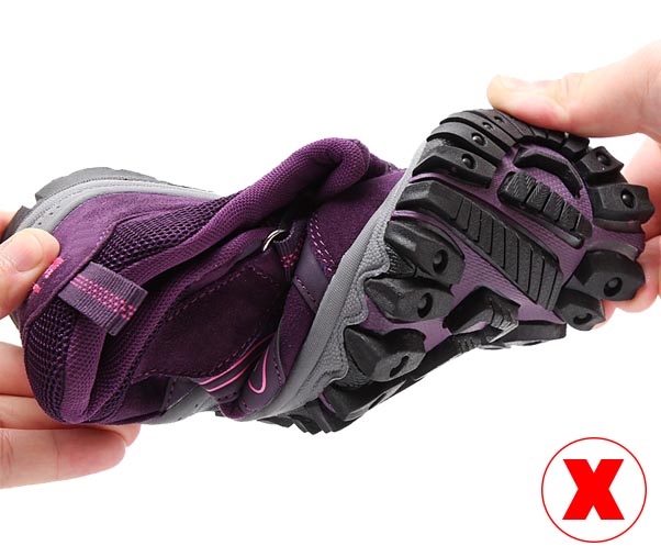 2) 拿鞋头来对折看看,好的弯曲部位,是在鞋子1/3的鞋头部位为佳,这是我们走路脚趾弯曲的部位。若鞋子的弯曲点在其他的部分,说明了这鞋的鞋底太软了,保护力度不足,易造成脚踝扭伤。